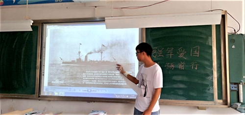 1894年(光绪二十年)7月25日丰岛海战爆发,甲午战争开始,由于日本蓄谋已久,而清朝仓皇迎战,这场战争以中国战败、北洋水师全军覆没告终。中国清朝政府迫于日本军国主义的军事压力,1895年4月17日签订了《马关条约》。刘茂臻通过生动的讲解,还原了当时情景,分析了旧中国的社会环境,使同学们了解到了历史的面貌,激发了同学们爱国主义热情,并表示勿忘国耻、积极进取。
