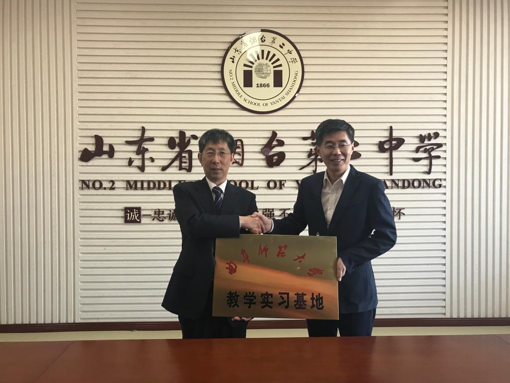10月18日下午,bat365与烟台二中举行联合育人签约暨曲师大教学实习基地授牌仪式,bat365党委书记赵琪、院长尤进茂、副院长冯媛媛,烟台二中校长蔡润圃等相关领导参加了仪式。