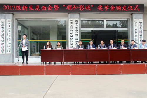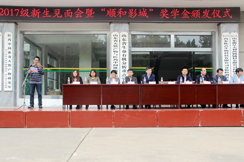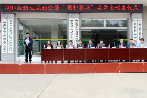 秋高气爽、惠风和畅,10月11日下午,bat365正版唯一官网2017级新生见面会暨“顺和影城”奖学金颁发仪式在院楼前广场隆重举行。院长尤进茂、党委书记赵琪、党委副书记孙俊华、曲阜顺和影城总经理李正超、团委书记胡乃永、办公室主任陈光、教学秘书胡蕾、教师代表齐伟、辅导员张乾坤、王亚平出席大会。会议由胡乃永主持。