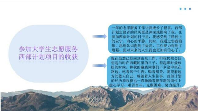 会议伊始,体育科学学院团委负责人简明扼要介绍了西部计划志愿者们的任职情况,紧接着西部计划志愿者们分享了自己在新疆地区的工作经历与心得体会,并补充了西部计划的相关政策,解答同学们疑问。最后,对本次分享会做出总结,鼓励同学们根据自身实际情况积极报名西部计划,到基层最前线实现自己的人生价值。至此,西部计划志愿者分享会圆满结束。